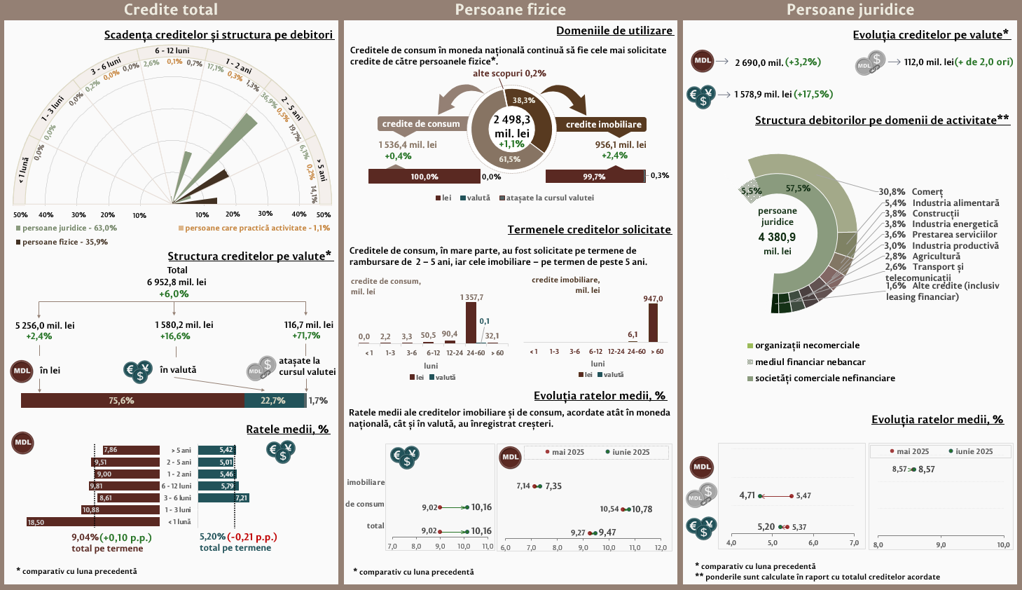 Persoanele fizice în luna iunie 2025 au contractat credite în volum de 2 498,3 milioane lei, în creștere cu 1,1 la sută față de luna precedentă, partea majoră (61,5 la sută) fiind acordată pentru consum (Infografic 2). Majoritatea creditelor de consum acordate persoanelor fizice (1 357,7 milioane lei) au fost acordate în moneda națională pe termene de la 2 până la 5 ani.