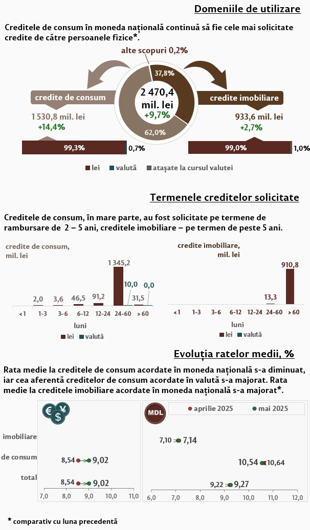 Persoanele fizice în luna mai 2025 au contractat credite în volum de 2 470,4 milioane lei (Infografic 2), în creștere cu 9,7 la sută față de luna precedentă, partea majoră (62,0 la sută) fiind acordată pentru consum. Majoritatea creditelor de consum acordate persoanelor fizice (1 345,2 milioane lei) au fost acordate în moneda națională pe termene de la 2 până la 5 ani.