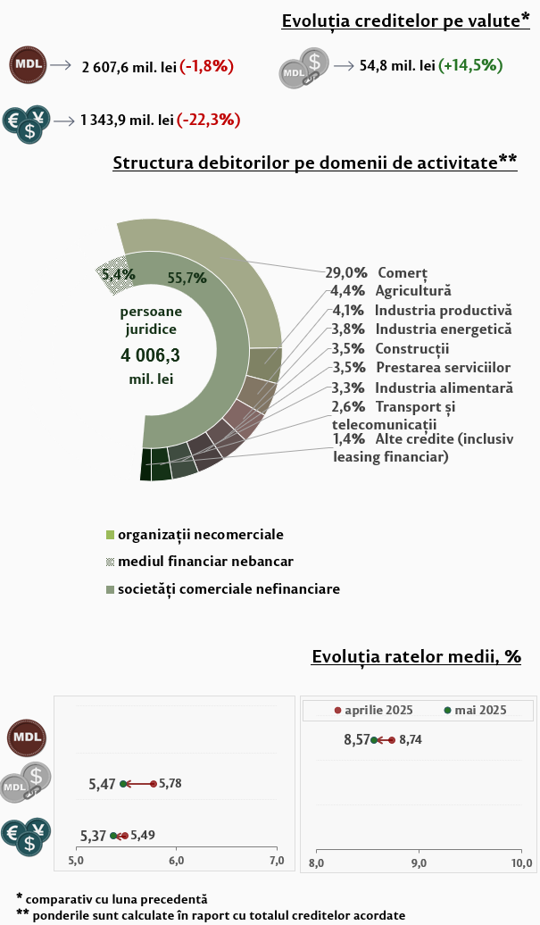 Rata medie la creditele acordate persoanelor juridice în moneda națională s-a diminuat cu 0,17 p.p., până la nivelul de 8,57 la sută, iar rata medie la creditele acordate în valută s-a diminuat cu 0,12 p.p. și a constituit 5,37 la sută.