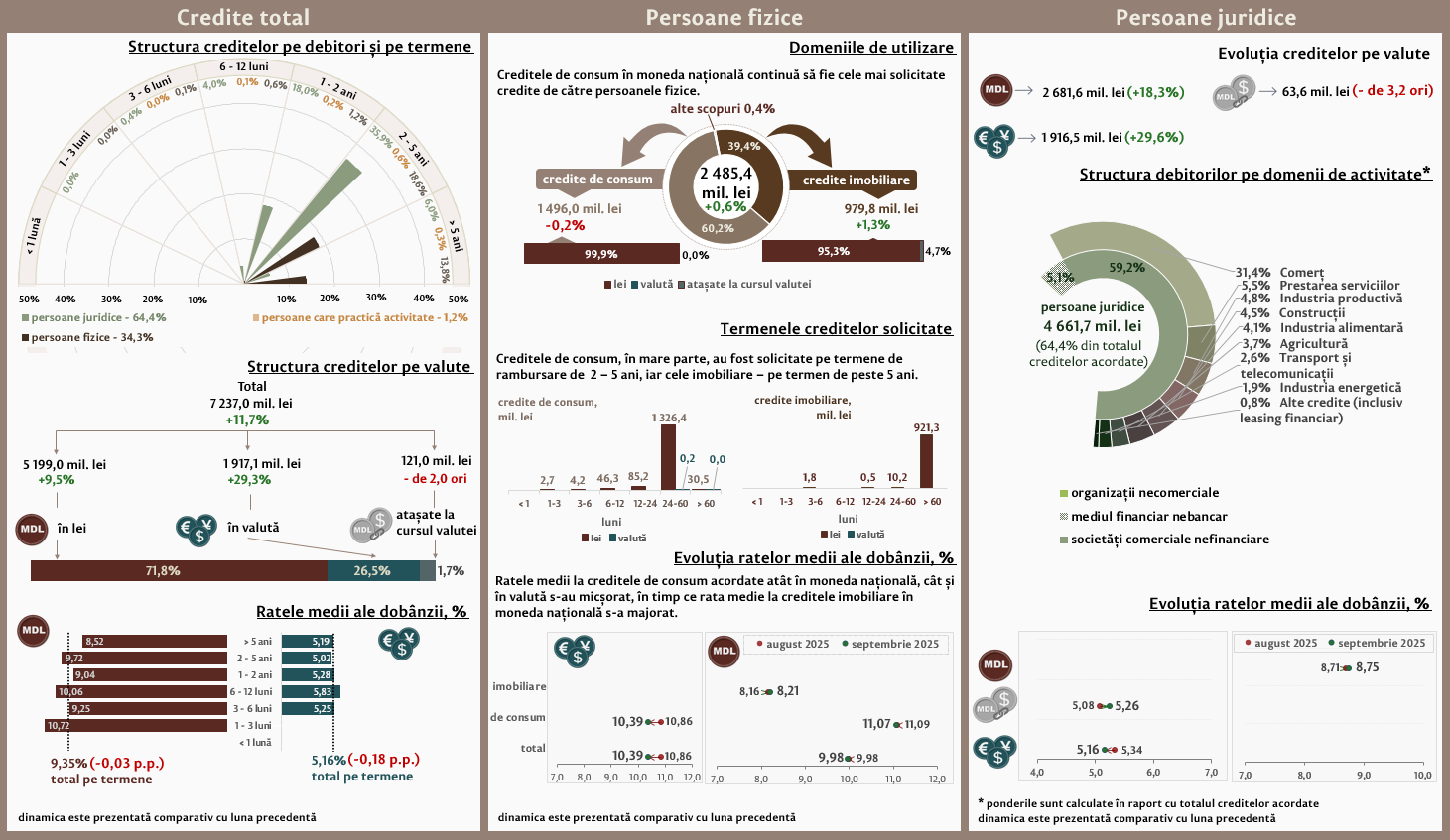 Persoanele fizice în luna septembrie 2025 au contractat credite în volum de 2 485,4 milioane lei, în creștere cu 0,6 la sută față de luna precedentă, partea majoră (60,2 la sută) fiind acordată pentru consum (Infografic 2). Majoritatea creditelor de consum acordate persoanelor fizice (1 326,4 milioane lei) au fost acordate în moneda națională pe termene de la 2 până la 5 ani.