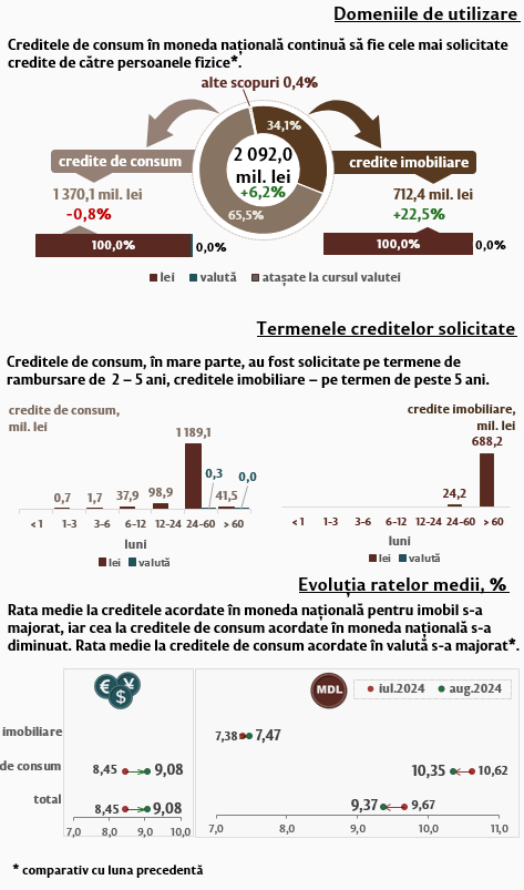 Persoanele fizice au contractat în luna august 2024 credite în volum de 2 092,0 milioane lei (Infografic 2), în creștere cu 6,2 la sută comparativ cu luna precedentă, partea majoră (65,5 la sută) fiind acordată pentru consum. Majoritatea creditelor de consum acordate persoanelor fizice (1 189,1 milioane lei) au fost acordate în moneda națională pe termene de la 2 până la 5 ani.