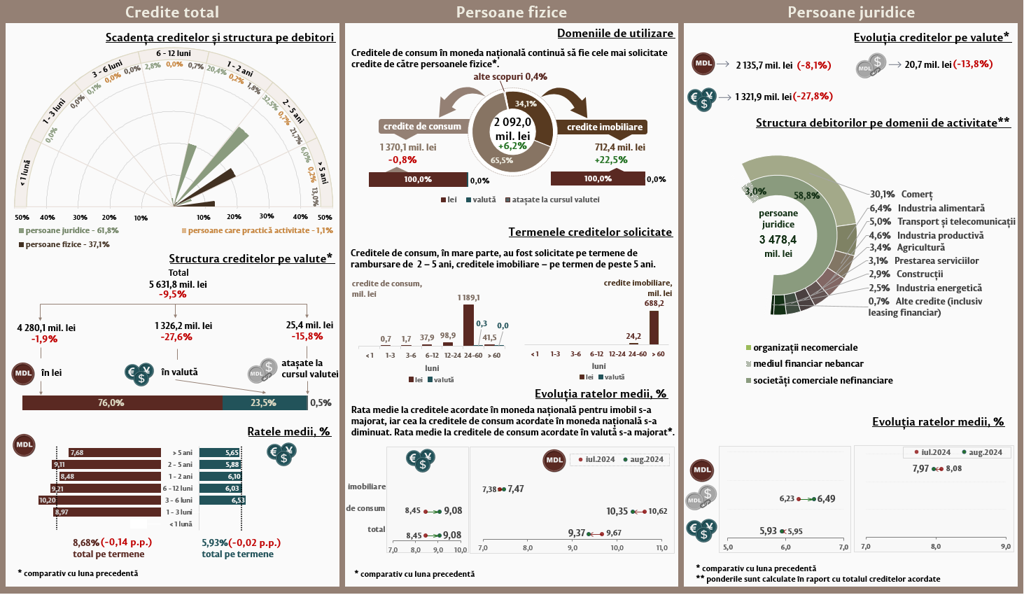 În luna august 2024, creditele noi1 acordate (Infografic 1) au constituit 5 631,8 milioane lei, în descreștere cu 9,5 la sută față de luna iulie 2024. Partea majoră (76,0 la sută) reprezintă creditele în moneda națională, care au constituit 4 280,1 milioane lei, în descreștere cu 1,9 la sută față de luna precedentă.