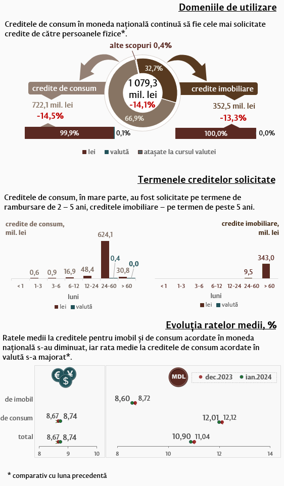 Persoanele fizice au contractat în luna ianuarie 2024 credite (Infografic 2) în volum de 1 079,3 milioane lei, în descreștere cu 14,1 la sută comparativ cu luna precedentă, partea majoră (66,9 la sută) fiind acordată pentru consum. Majoritatea acestor credite (624,1 milioane lei) au fost acordate în moneda națională pe termene de la 2 până la 5 ani.