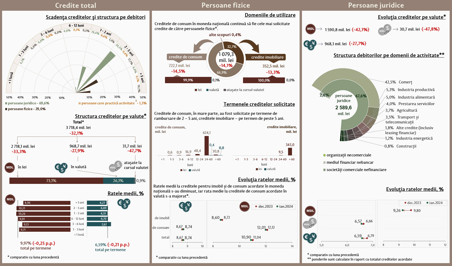 În luna ianuarie 2024, creditele noi acordate1 (Infografic 1) au constituit 3 718,4 milioane lei, în descreștere cu 32,1 la sută față de luna decembrie 2023. Partea majoră (73,1 la sută) reprezintă creditele în moneda națională, care au constituit 2 718,1 milioane lei, în descreștere cu 33,3 la sută față de luna precedentă.