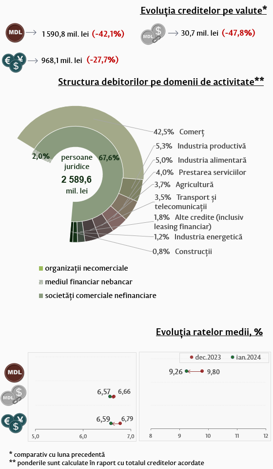 Rata medie la creditele acordate persoanelor juridice în moneda națională s-a diminuat cu 0,54 puncte procentuale, până la nivelul de 9,26 la sută. În același timp, rata medie la creditele acordate în valută s-a diminuat cu 0,20 puncte procentuale și a constituit 6,59 la sută.