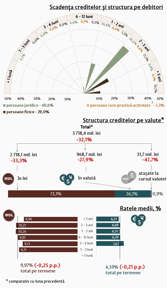 Rata medie nominală la creditele noi acordate în moneda națională s-a micșorat cu 0,25 puncte procentuale comparativ cu luna precedentă și a constituit 9,97 la sută, rata medie la cele în valută s-a micșorat cu 0,21 puncte procentuale, constituind 6,59 la sută.