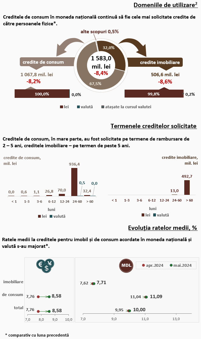 Persoanele fizice au contractat în luna mai 2024 credite (Infografic 2) în volum de 1 583,0 milioane lei, în descreștere cu 8,4 la sută comparativ cu luna precedentă, partea majoră (67,5 la sută) fiind acordată pentru consum. Majoritatea creditelor de consum acordate persoanelor fizice (936,4 milioane lei) au fost acordate în moneda națională pe termene de la 2 până la 5 ani.