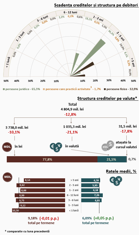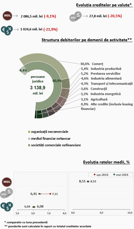 Rata medie la creditele acordate persoanelor juridice în moneda națională s-a diminuat cu 0,02 puncte procentuale, până la nivelul de 8,51 la sută. În același timp, rata medie la creditele acordate în valută s-a majorat cu 0,04 puncte procentuale și a constituit 6,08 la sută.