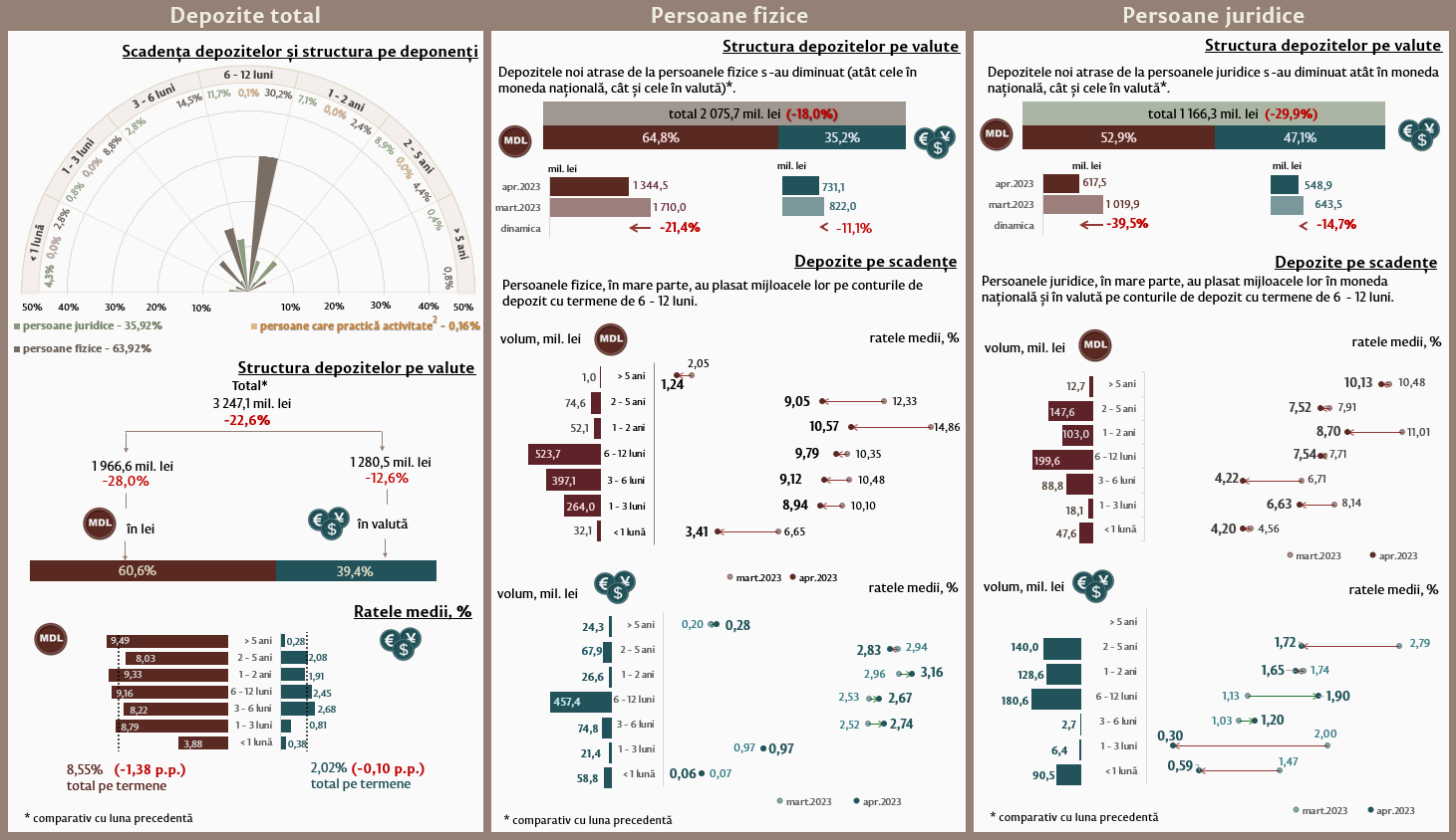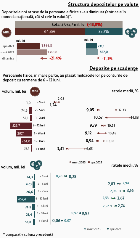 În luna aprilie 2023, depozitele noi atrase1 la termen (Infografic 1) au constituit 3 247,1 milioane lei, micșorându-se cu 22,6 la sută față de luna martie 2023. Depozitele atrase în moneda națională au înregistrat o pondere majoră de 60,6 la sută și au constituit 1 966,6 milioane lei, în descreștere cu 28,0 la sută față de luna precedentă.