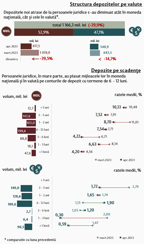 În aprilie 2023, comparativ cu luna precedentă, depozitele în moneda națională ale persoanelor juridice (Infografic 3) s-au micșorat cu 39,5 la sută, iar depozitele în valută cu 14,7 la sută, respectiv. Depozitele în moneda națională ale persoanelor juridice au constituit 617,5 milioane lei, iar cele în valută – 548,9 milioane lei.