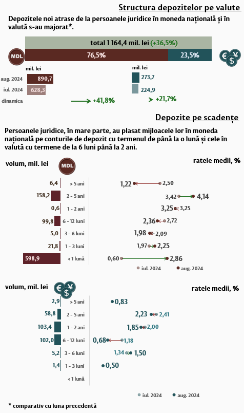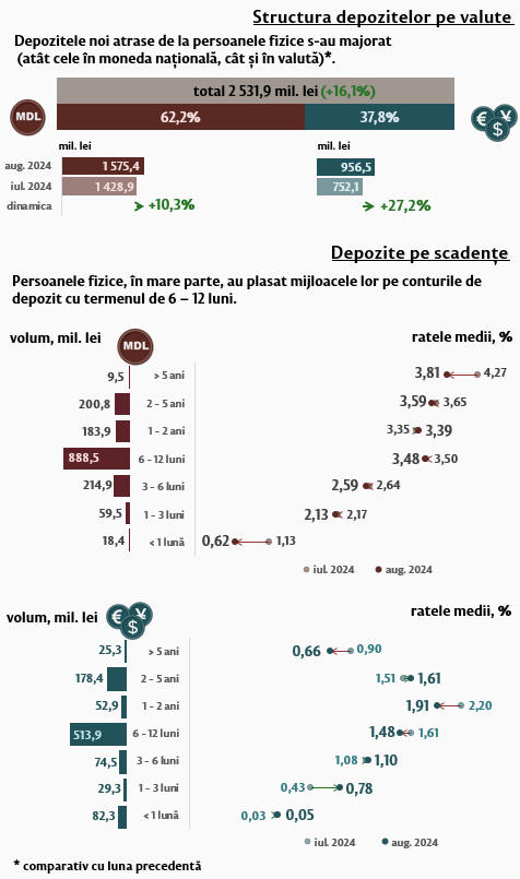 În luna august 2024, depozitele noi1 atrase la termen (Infografic 1) au constituit 3 697,5 milioane lei, majorându-se cu 21,9 la sută față de luna iulie 2024. Depozitele atrase în moneda națională au înregistrat o pondere majoră de 66,7 la sută și au însumat 2 466,5 milioane lei, în creștere cu 19,9 la sută față de luna precedentă. Depozitele atrase în valută au totalizat 1 231,0 milioane lei, fiind în creștere cu 26,0 la sută față de luna precedentă.