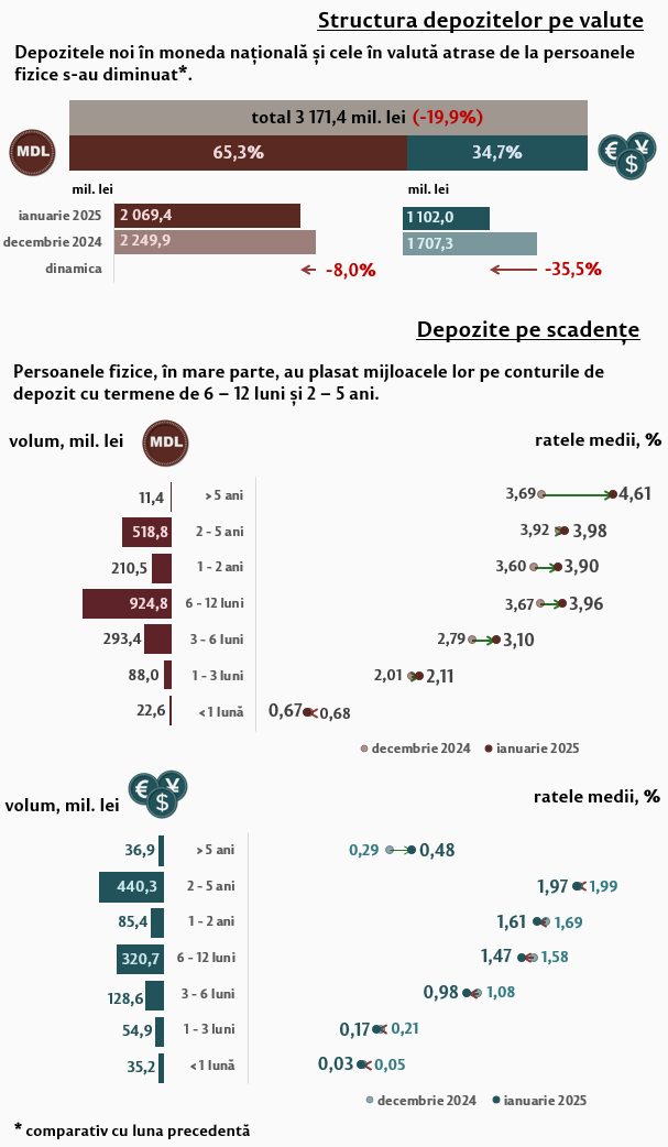 Depozitele persoanelor fizice au constituit în luna de referință 3 171,4 milioane lei, în descreștere cu 19,9 la sută comparativ cu luna precedentă (Infografic 2). Cele mai solicitate au fost depozitele cu termene de la 6 până la 12 luni (39,3 la sută) și depozitele cu termene de la 2 până la 5 ani (30,2 la sută) din totalul depozitelor persoanelor fizice. Comparativ cu ianuarie 2024, depozitele în moneda națională ale persoanelor fizice s-au diminuat cu 20,5 la sută, iar cele în valută s-au majorat cu 15,6 la sută.