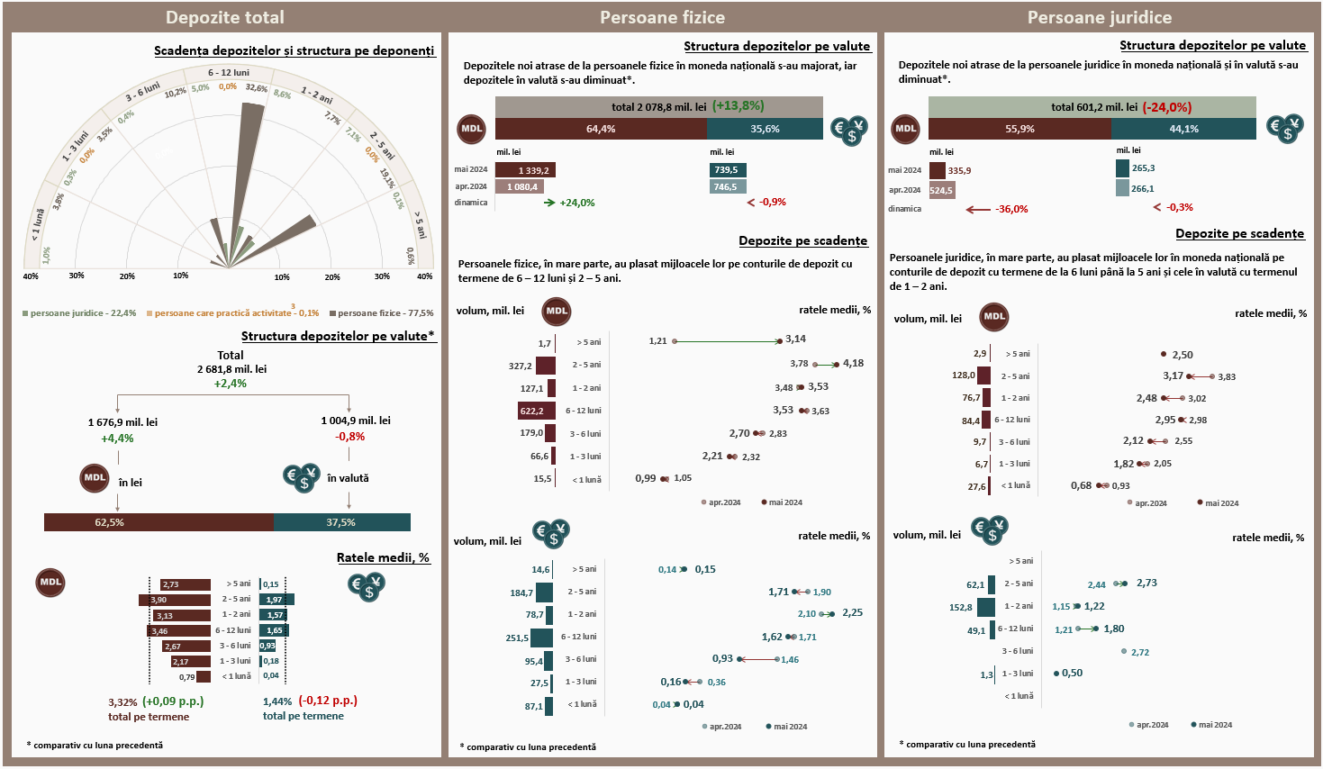 În luna mai 2024, depozitele noi1 atrase la termen (Infografic 1) au constituit 2 681,8 milioane lei, majorându-se cu 2,4 la sută față de luna aprilie 2024. Depozitele atrase în moneda națională au înregistrat o pondere majoră de 62,5 la sută și au însumat 1 676,9 milioane lei, în creștere cu 4,4 la sută față de luna precedentă. Depozitele atrase în valută au totalizat 1 004,9 milioane lei, fiind în descreștere cu 0,8 la sută față de luna precedentă.