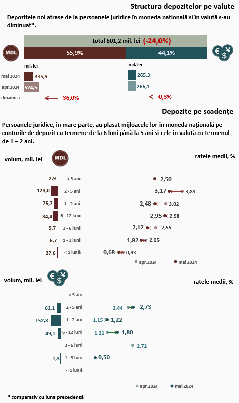 În mai 2024, comparativ cu luna precedentă, depozitele în moneda națională ale persoanelor juridice (Infografic 3) s-au diminuat cu 36,0 la sută, iar cele în valută cu 0,3 la sută. Depozitele în moneda națională ale persoanelor juridice au constituit 335,9 milioane lei, iar cele în valută – 265,3 milioane lei.