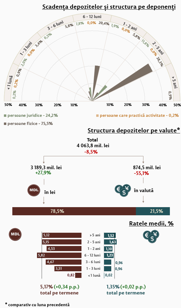 Rata medie la depozitele atrase în moneda națională de la persoanele fizice, comparativ cu luna precedentă, s-a majorat cu 0,12 p.p., până la nivelul de 5,28 la sută. Rata medie la depozitele atrase în valută s-a diminuat cu 0,12 p.p. și a constituit 1,23 la sută.