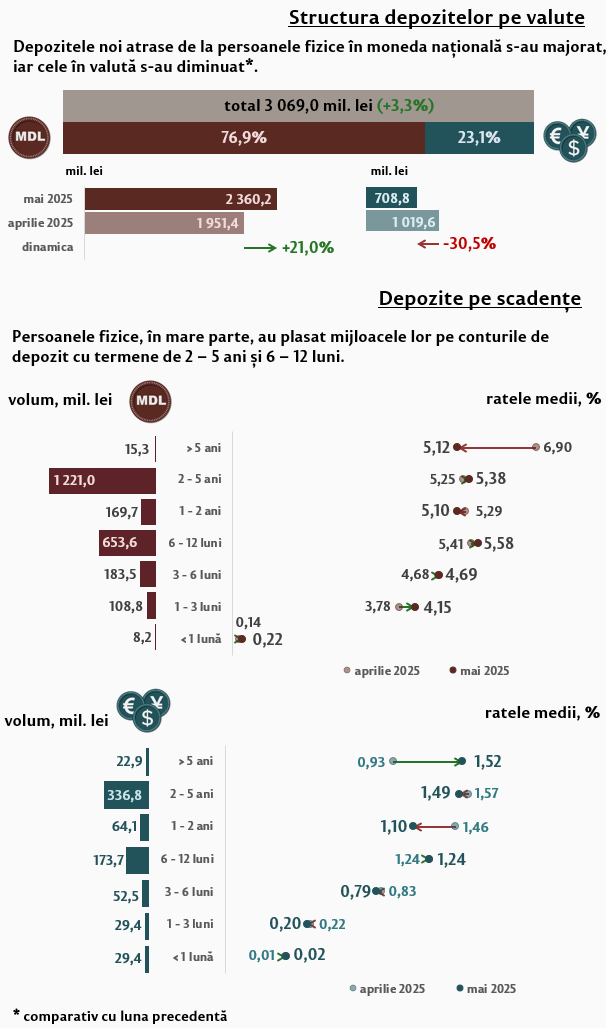 În luna mai 2025, depozitele noi1 atrase la termen (Infografic 1) au constituit 4 063,8 milioane lei, micșorându-se cu 8,5 la sută față de luna aprilie 2025. Depozitele atrase în moneda națională au înregistrat o pondere de 78,5 la sută și au însumat 3 189,3 milioane lei, fiind în creștere cu 27,9 la sută față de luna precedentă. Depozitele atrase în valută au totalizat 874,5 milioane lei, înregistrând o descreștere cu 55,1 la sută față de luna precedentă.