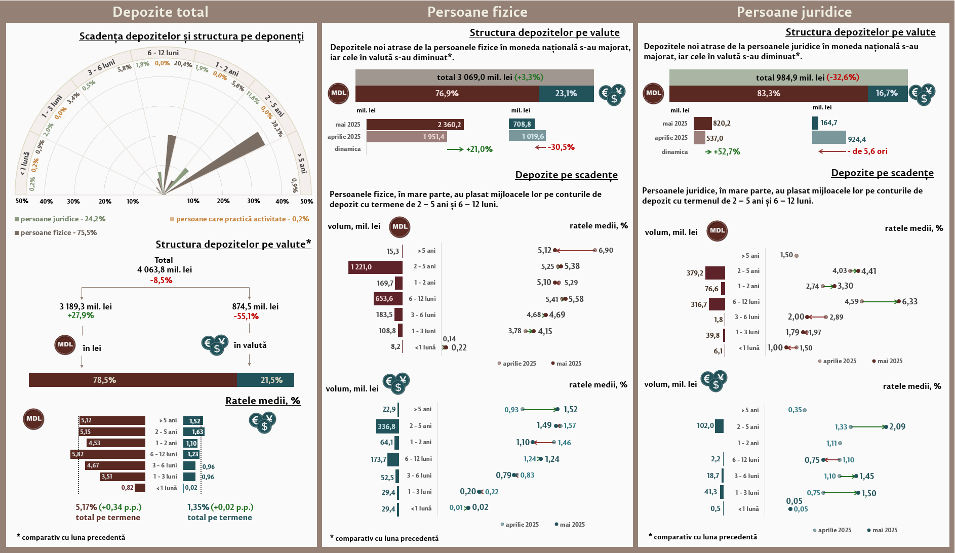 În mai 2025, comparativ cu luna precedentă, depozitele în moneda națională ale persoanelor juridice (Infografic 3) s-au majorat cu 52,7 la sută, iar cele în valută s-au diminuat de 5,6 ori. Depozitele în moneda națională ale persoanelor juridice au constituit 820,2 milioane lei, iar cele în valută – 164,7 milioane lei. Comparativ cu mai 2024, depozitele în moneda națională ale persoanelor juridice s-au majorat de 2,4 ori, iar cele în valută s-au diminuat cu 37,9 la sută.