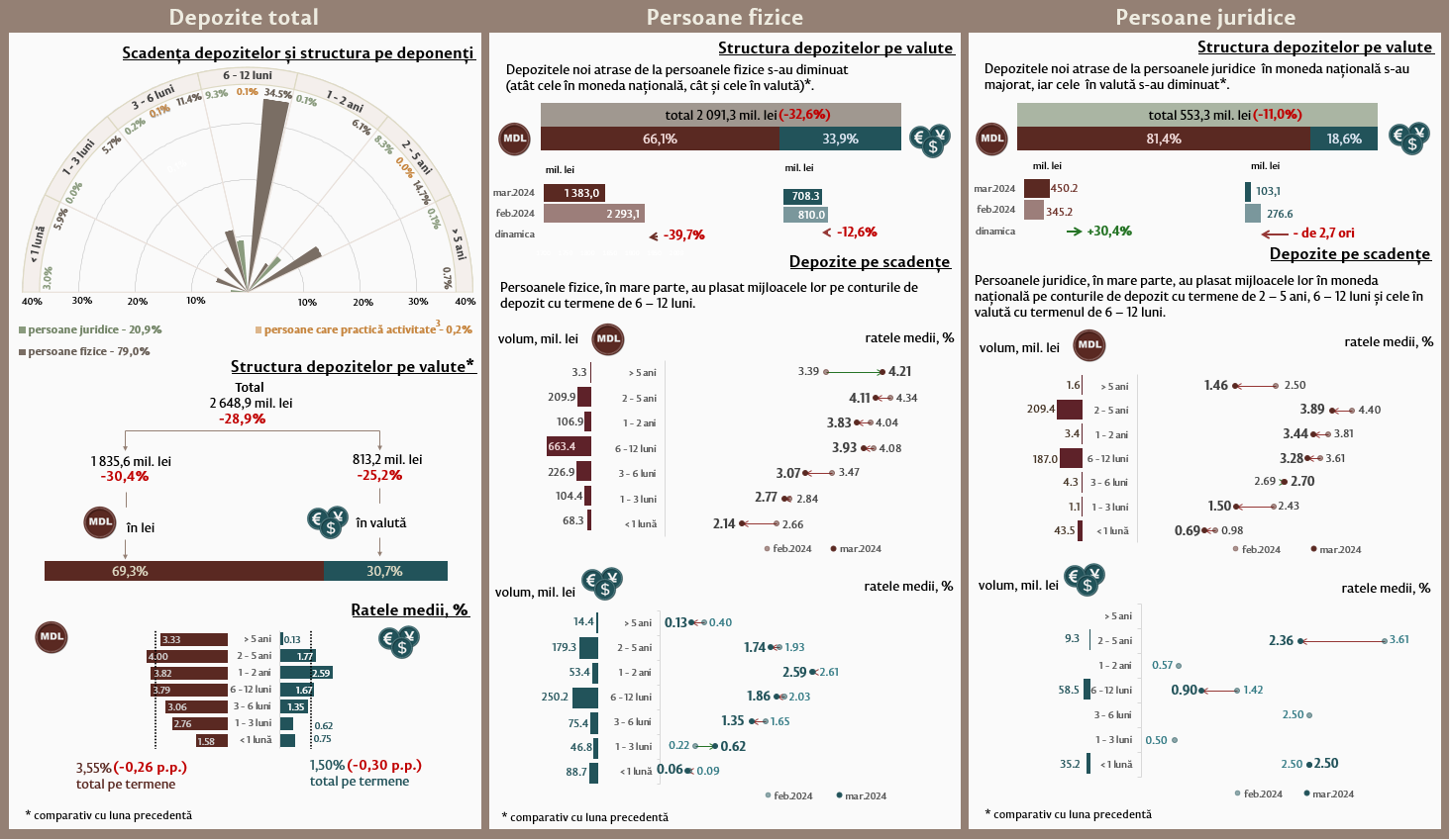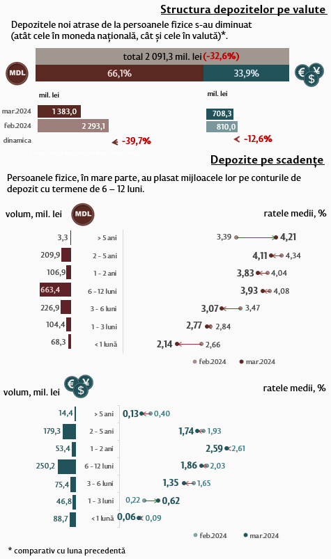 În luna martie 2024, depozitele noi atrase1 la termen (Infografic 1) au constituit 2 648,9 milioane lei, diminuându-se cu 28,9 la sută față de luna februarie 2024. Depozitele atrase în moneda națională au înregistrat o pondere majoră de 69,3 la sută și au însumat 1 835,6 milioane lei, în descreștere cu 30,4 la sută față de luna precedentă. Depozitele atrase în valută au totalizat 813,2 milioane lei, fiind în descreștere cu 25,2 la sută față de luna precedentă.