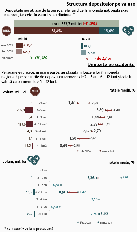 În martie 2024, comparativ cu luna precedentă, depozitele în moneda națională ale persoanelor juridice (Infografic 3) s-au majorat cu 30,4 la sută, iar depozitele în valută s-au diminuat de 2,7 ori. Depozitele în moneda națională ale persoanelor juridice au constituit 450,2 milioane lei, iar cele în valută – 103,1 milioane lei.