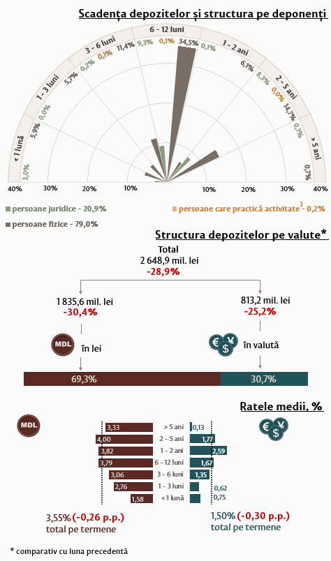 Rata medie nominală la depozitele noi atrase în moneda națională s-a diminuat cu 0,26 puncte procentuale comparativ cu luna precedentă și a constituit 3,55 la sută. Rata medie nominală la depozitele în valută s-a micșorat cu 0,30 puncte procentuale, constituind 1,50 la sută.