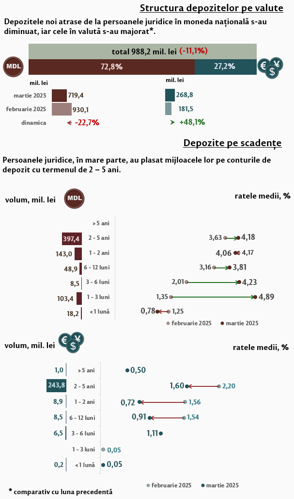 În martie 2025, comparativ cu luna precedentă, depozitele în moneda națională ale persoanelor juridice (Infografic 3) s-au micșorat cu 22,7 la sută, iar cele în valută s-au majorat cu 48,1 la sută. Depozitele în moneda națională ale persoanelor juridice au constituit 719,4 milioane lei, iar cele în valută – 268,8 milioane lei. Comparativ cu martie 2024, depozitele în moneda națională ale persoanelor juridice s-au majorat cu 59,8 la sută, iar cele în valută s-au majorat de 2,6 ori.