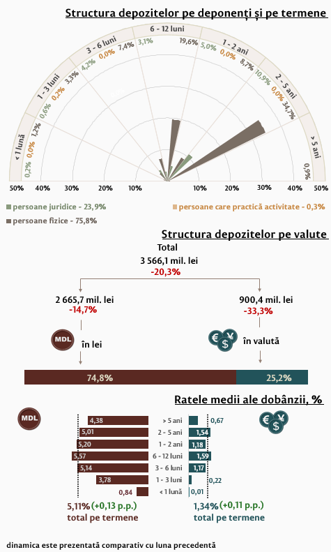 Din perspectiva termenelor de plasare, cele mai mari ponderi în totalul depozitelor la termen le-au revenit depozitelor cu termenul de la 2 până la 5 ani (45,7 la sută) și de la 6 până la 12 luni (22,6 la sută).