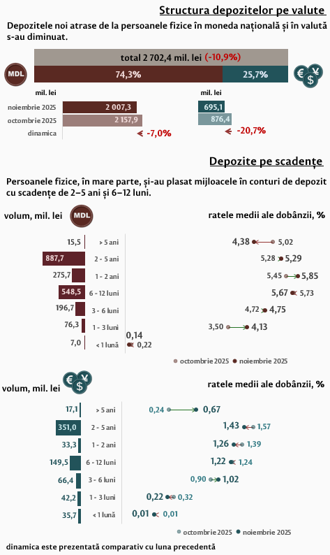 În luna noiembrie 2025, depozitele noi1 atrase la termen au constituit 3 566,1 milioane lei, micșorându-se cu 20,3 la sută față de luna octombrie 2025 (Infografic 1). Depozitele atrase în moneda națională au înregistrat o pondere de 74,8 la sută și au însumat 2 665,7 milioane lei, fiind în descreștere cu 14,7 la sută față de luna precedentă. Depozitele atrase în valută au totalizat 900,4 milioane lei, înregistrând o descreștere cu 33,3 la sută față de luna precedentă.