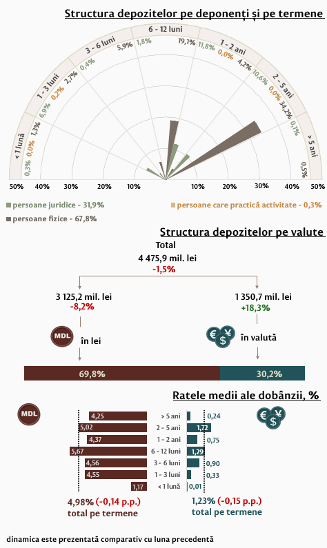 Rata medie nominală la depozitele noi atrase în moneda națională s-a micșorat cu 0,14 puncte procentuale (p.p.) comparativ cu luna precedentă și a constituit 4,98 la sută. Rata medie nominală la depozitele în valută s-a micșorat cu 0,15 p.p., constituind 1,23 la sută.