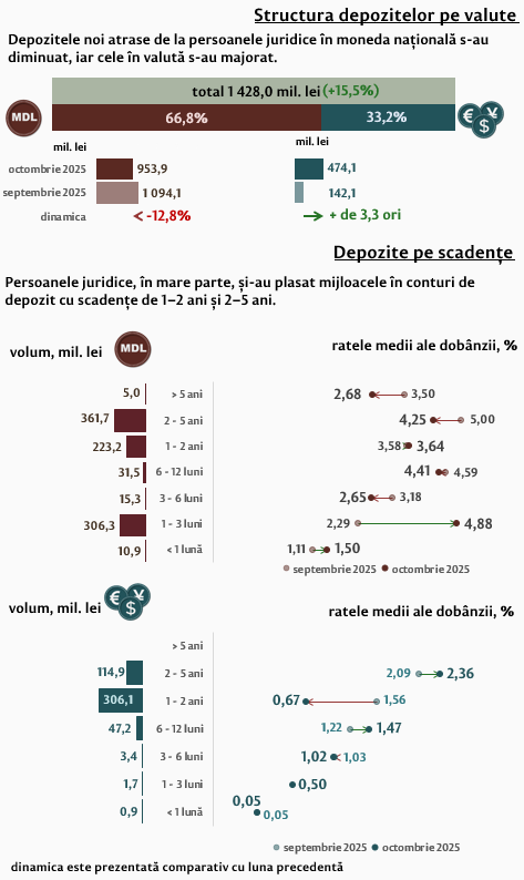 În octombrie 2025, depozitele persoanelor juridice au constituit 1 428,0 milioane lei, fiind în creștere cu 15,5 la sută față de luna precedentă, depozitele în moneda națională reprezintă 953,9 milioane lei (-12,8 la sută), iar cele în valută – 474,1 milioane lei (+3,3 ori). Comparativ cu octombrie 2024, depozitele în moneda națională ale persoanelor juridice s-au majorat cu 15,7 la sută, iar cele în valută s-au majorat de 2,3 ori.