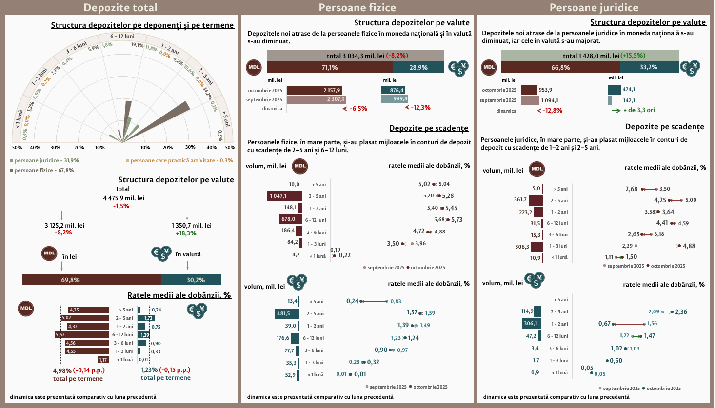 În luna octombrie 2025, depozitele noi1 atrase la termen au constituit 4 475,9 milioane lei, micșorându-se cu 1,5 la sută față de luna septembrie 2025 (Infografic 1). Depozitele atrase în moneda națională au înregistrat o pondere de 69,8 la sută și au însumat 3 125,2 milioane lei, fiind în descreștere cu 8,2 la sută față de luna precedentă. Depozitele atrase în valută au totalizat 1 350,7 milioane lei, înregistrând o creștere cu 18,3 la sută față de luna precedentă.