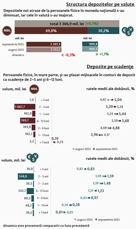 Depozitele persoanelor fizice au constituit, în luna de referință, 3 306,9 milioane lei, în creștere cu 0,1 la sută comparativ cu luna precedentă (Infografic 2). Cele mai solicitate au fost depozitele cu termene de la 2 până la 5 ani și de la 6 până la 12 luni, cu o pondere de 48,9 la sută și respectiv 30,6 la sută din totalul depozitelor persoanelor fizice. Comparativ cu septembrie 2024, depozitele în moneda națională ale persoanelor fizice s-au majorat cu 60,1 la sută, iar cele în valută – cu 12,7 la sută.