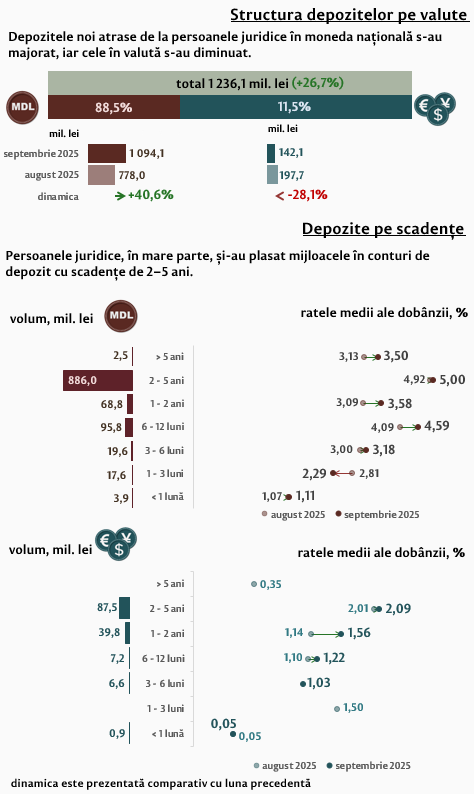 În septembrie 2025 depozitele persoanelor juridice au constituit 1 236,1 milioane lei, fiind în creștere cu 26,7 la sută față de luna precedentă, depozitele în moneda națională reprezintă 1 094,1 milioane lei (+40,6 la sută), iar cele în valută – 142,1 milioane lei (-28,1 la sută). Comparativ cu septembrie 2024, depozitele în moneda națională ale persoanelor juridice s-au majorat de 3,3 ori, iar cele în valută s-au micșorat cu 32,4 la sută.