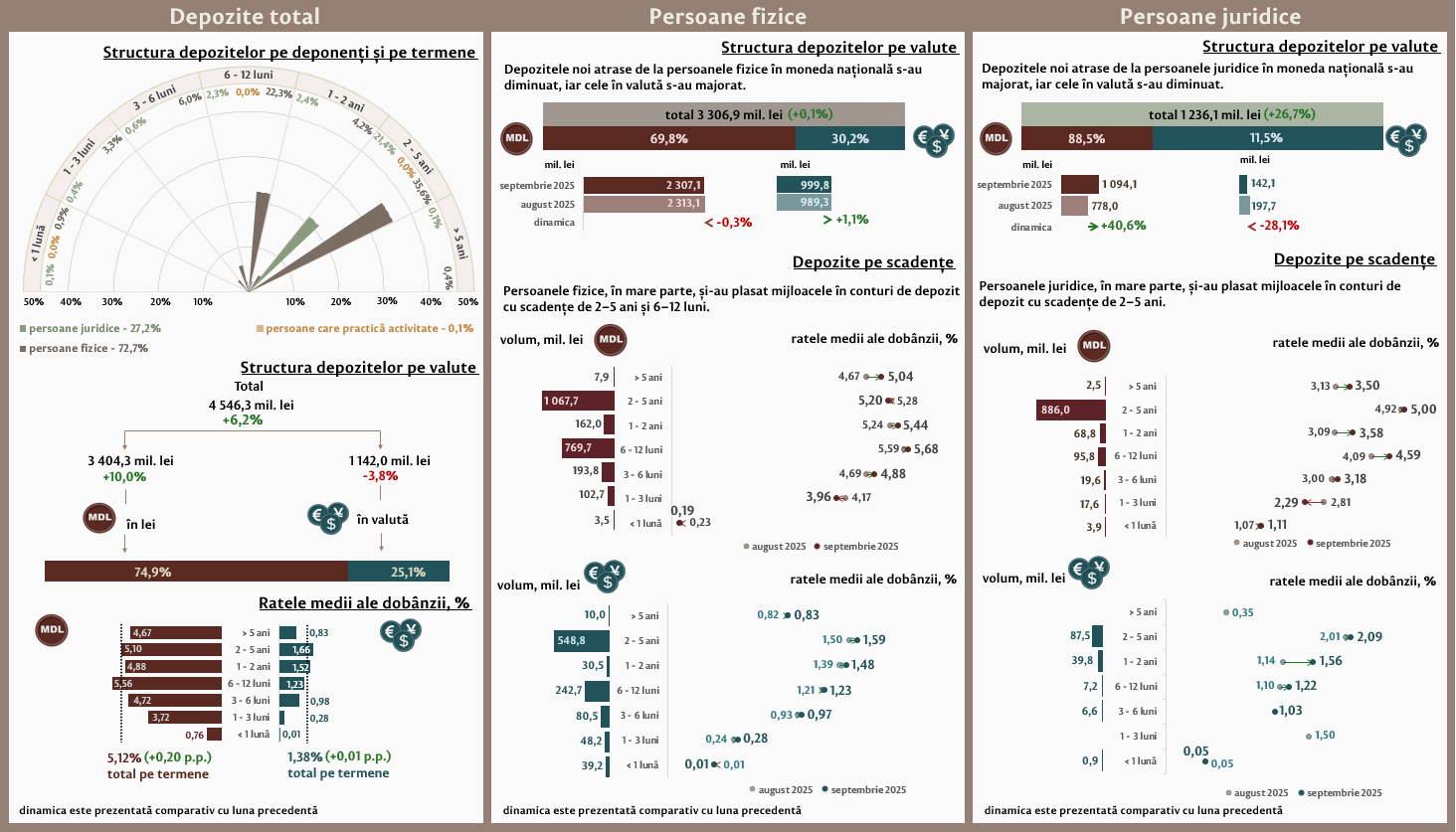 În luna septembrie 2025, depozitele noi1 atrase la termen au constituit 4 546,3 milioane lei, majorându-se cu 6,2 la sută față de luna august 2025 (Infografic 1). Depozitele atrase în moneda națională au înregistrat o pondere de 74,9 la sută și au însumat 3 404,3 milioane lei, fiind în creștere cu 10,0 la sută față de luna precedentă. Depozitele atrase în valută au totalizat 1 142,0 milioane lei, înregistrând o descreștere cu 3,8 la sută față de luna precedentă.