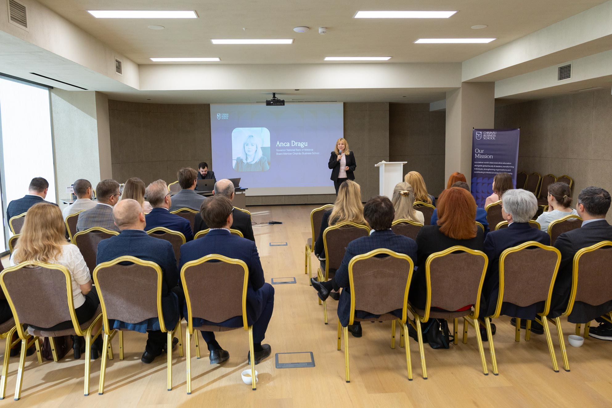 Evenimentul a reunit reprezentanți ai mediului academic, financiar-bancar și de afaceri, printre care Alina Prahoveanu, Președinta Asociației Directorilor Independenți din România, Ana Bobircă, reprezentantă Bucharest Business School, precum și reprezentanți ai Chișinău Business School și ai Academiei de Studii Economice din Moldova.