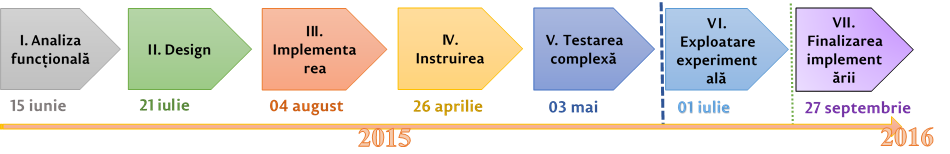 Proiectul în cauză s-a derulat în mai multe etape ce vizează: analiza funcțională, elaborarea designului, implementarea și parametrizarea, instruirea, testarea și exploatarea experimentală.