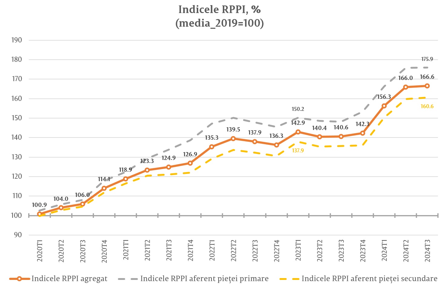 Indicele RPPI aferent prețului de ofertă pentru bunurile imobile prezentate pe piața primară a înregistrat valoarea de 175,9 la sută, fiind practic neschimbat față de trimestrul II 2024, în același timp fiind în creștere cu 18,8 la sută față de trimestrul III 2023.
