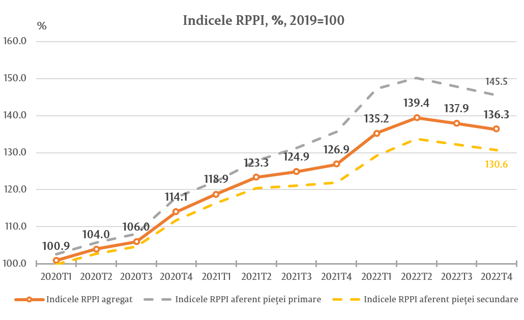 Indicele RPPI aferent prețului de ofertă pentru bunurile imobile prezentate pe piața primară a înregistrat valoarea de 145,5 la sută, fiind în descreștere cu 1,5 la sută față de trimestrul III 2022 și în creștere cu 7,3 la sută față de trimestrul IV 2021.