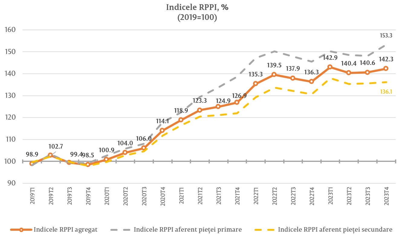 Indicele RPPI aferent prețului de ofertă pentru bunurile imobile din cadrul pieței secundare a înregistrat valoarea de 136,1 la sută, fiind în creștere cu 0,3 la sută față de trimestrul III 2023 și  cu 4,2 la sută față de trimestrul IV 2022.
