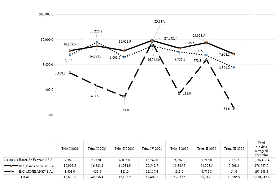 Diagrama încasărilor înregistrate de Banca de Economii S.A., BC „BANCA SOCIALĂ” S.A. și B.C. „UNIBANK” S.A. pe parcursul perioadei 01.01.2021-31.09.2022, inclusiv