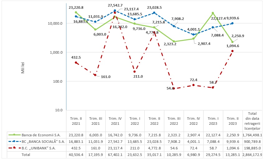 Lichidatorii celor trei bănci în proces de lichidare întreprind în continuare măsuri în vederea valorificării activelor. Astfel, din data retragerii licențelor (16.10.2015) Băncii de Economii S.A., BC „BANCA SOCIALĂ” S.A. și B.C. „UNIBANK” S.A. și până la 30.06.2023 băncile în cauză au încasat mijloace bănești în sumă totală de 2 864 172,9 mii lei.