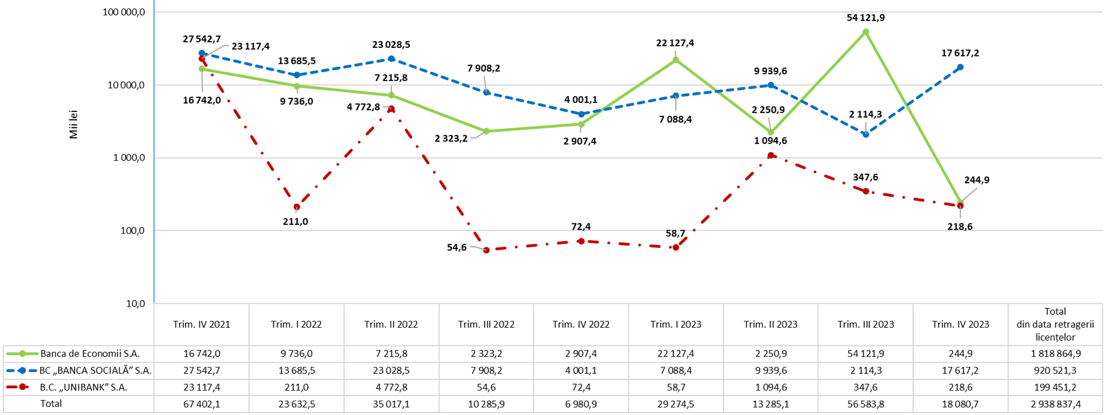 Lichidatorii celor trei bănci în proces de lichidare întreprind în continuare măsuri în vederea valorificării activelor. Astfel, din data retragerii licențelor (16.10.2015) Băncii de Economii S.A., BC „BANCA SOCIALĂ” S.A. și B.C. „UNIBANK” S.A. și până la 31.12.2023 băncile în cauză au încasat mijloace bănești în sumă totală de 2 938 837,4 mii lei.