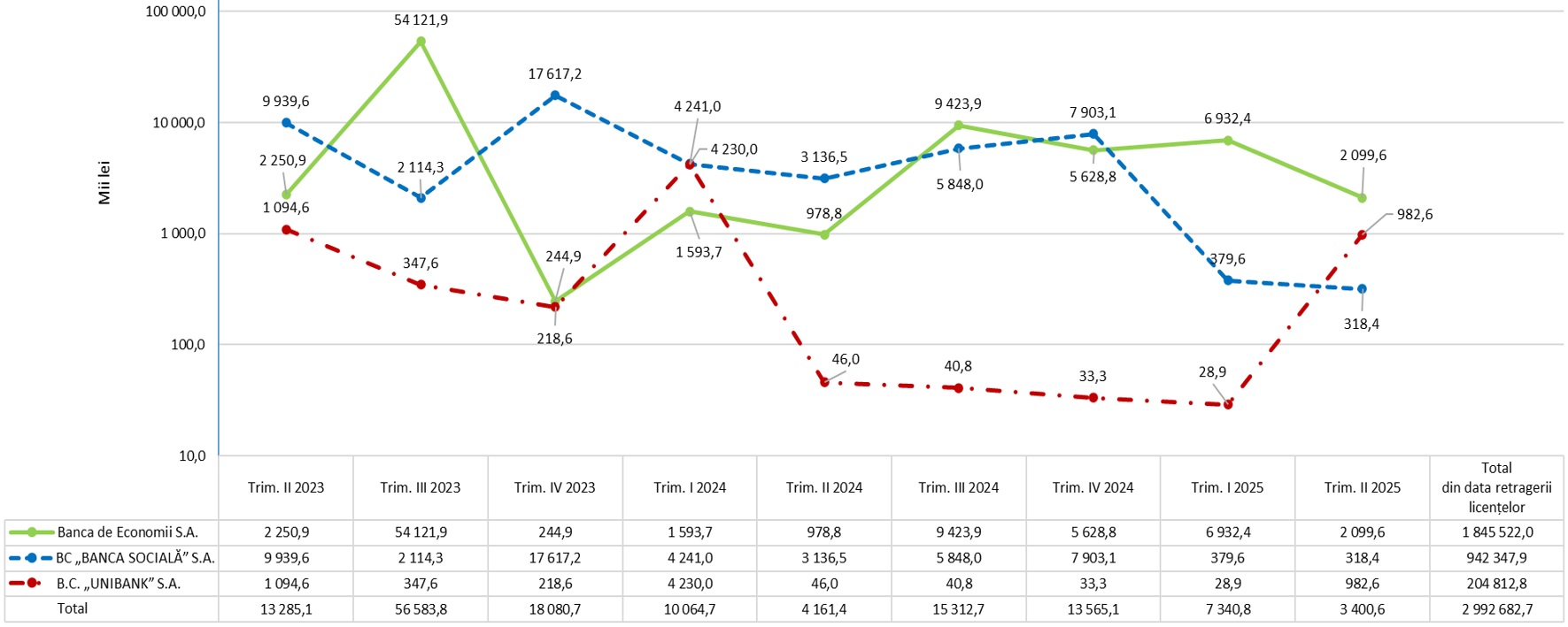 Lichidatorii celor trei bănci în proces de lichidare întreprind în continuare măsuri în vederea valorificării activelor. Astfel, din data retragerii licențelor (16.10.2015) Băncii de Economii S.A., BC „BANCA SOCIALĂ” S.A. și B.C. „UNIBANK” S.A. și până la 30.06.2025 băncile în cauză au încasat mijloace bănești în sumă totală de 2 992 682,7 mii lei.