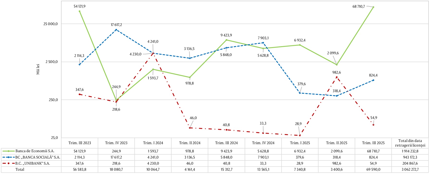 Figura 1. Diagrama încasărilor înregistrate de Banca de Economii S.A., BC „BANCA SOCIALĂ” S.A. și B.C. „UNIBANK” S.A. pe parcursul perioadei Trim. III 2023 – Trim. III 2025, inclusiv