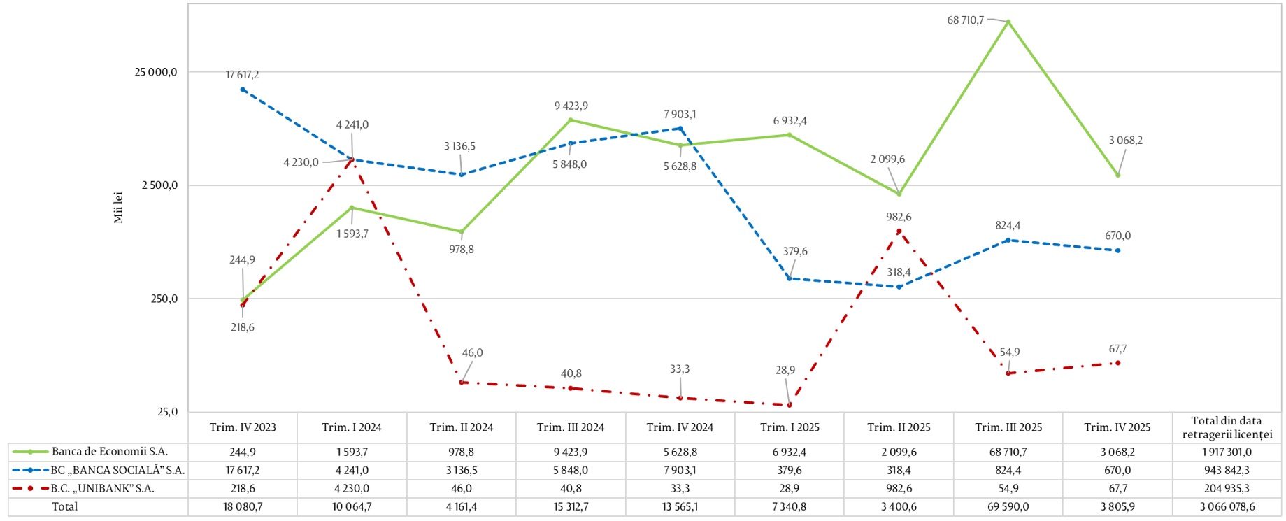 Figura 1. Diagrama încasărilor înregistrate de Banca de Economii S.A., BC „BANCA SOCIALĂ” S.A. și B.C. „UNIBANK” S.A. pe parcursul perioadei Trim. IV 2023 – Trim. IV 2025, inclusiv