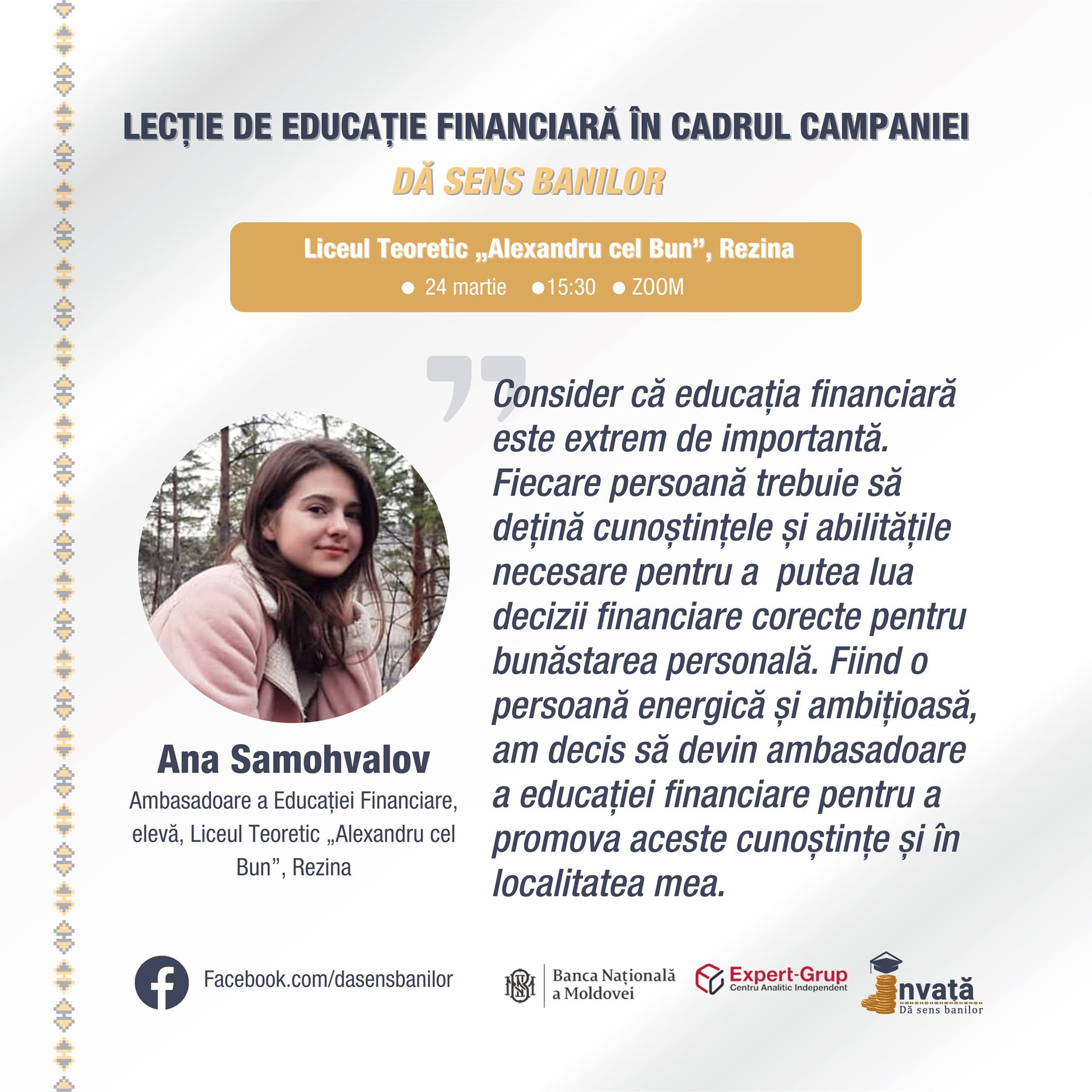 Și Ana Samohvalov, elevă la liceul „Alexandru cel Bun" din Rezina, consideră că educația financiară este foarte importantă:„Fiecare persoană trebuie să dețină cunoștințele și abilitățile necesare pentru a putea lua decizii corecte pentru bunăstarea personală”.