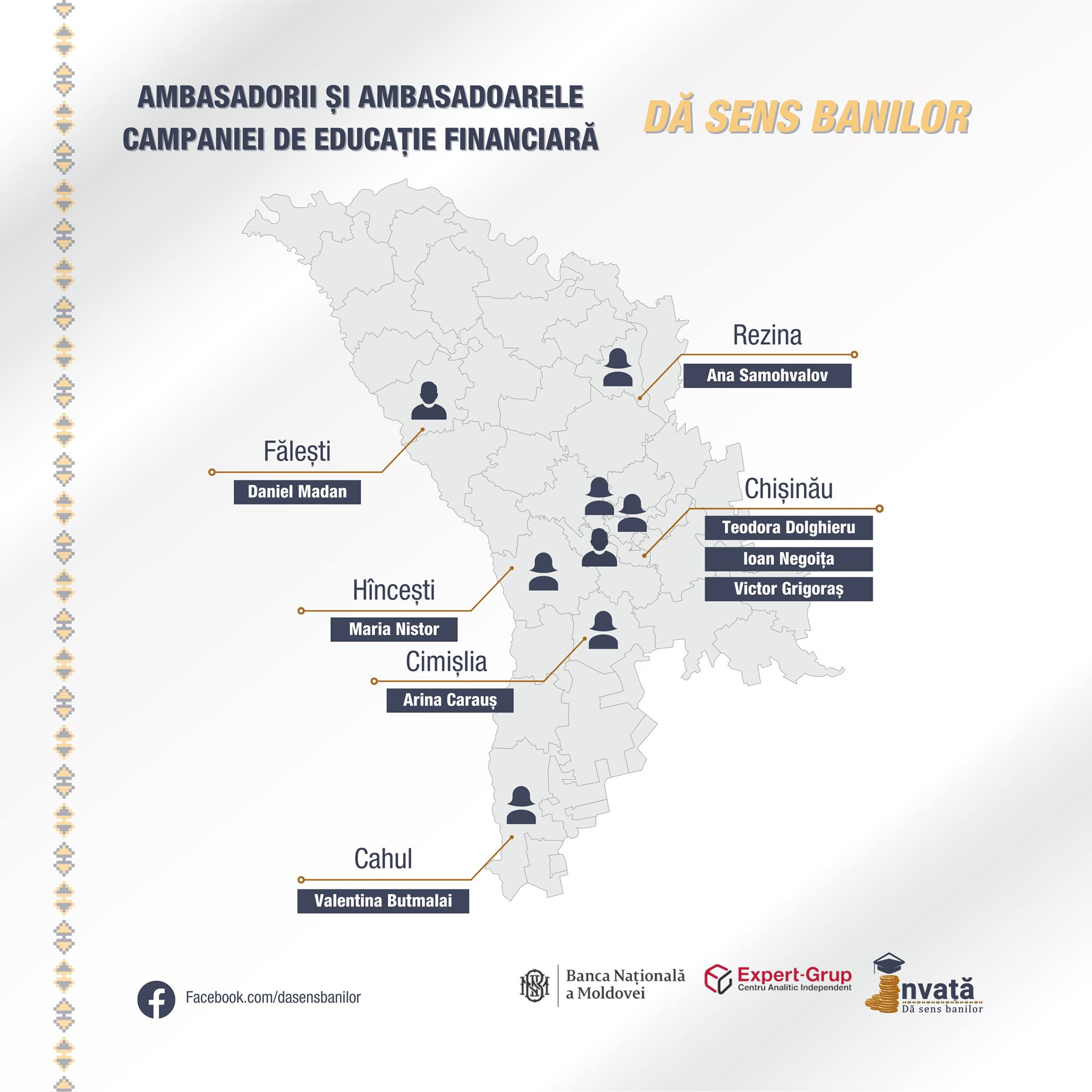 Elevi și studenți din șase raioane și municipii ale Republicii Moldova vor învăța în următoarele zile cum să dea sens banilor, în cadrul unor lecții publice online susținute de opt ambasadori ai educației financiare. Aceștia au fost selectați în urma unui concurs public și instruiți în cadrul proiectului „Dă sens banilor”, realizat de Banca Națională a Moldovei (BNM) și Centrul Analitic Independent „Expert-Grup”.