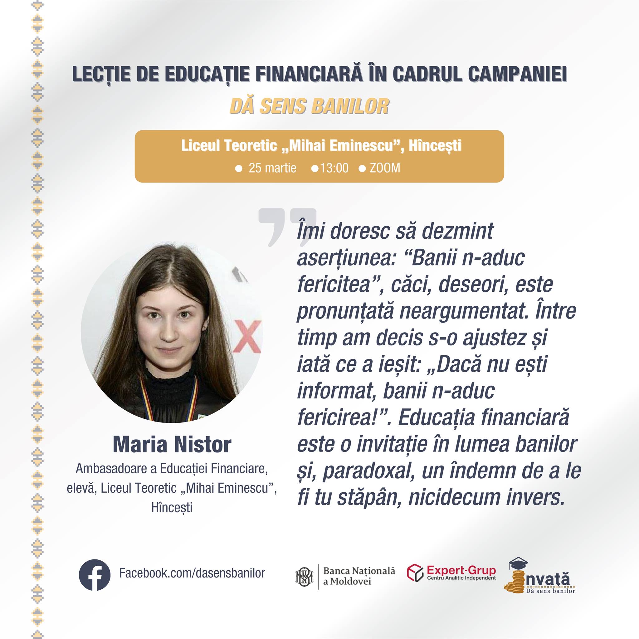 La rândul său, Măriuța Nistor,  elevă la Liceul Teoretic „Mihai Eminescu” din Hîncești, se arată  convinsă că „banii te pot face fericit, doar dacă-i gestionezi corect”.