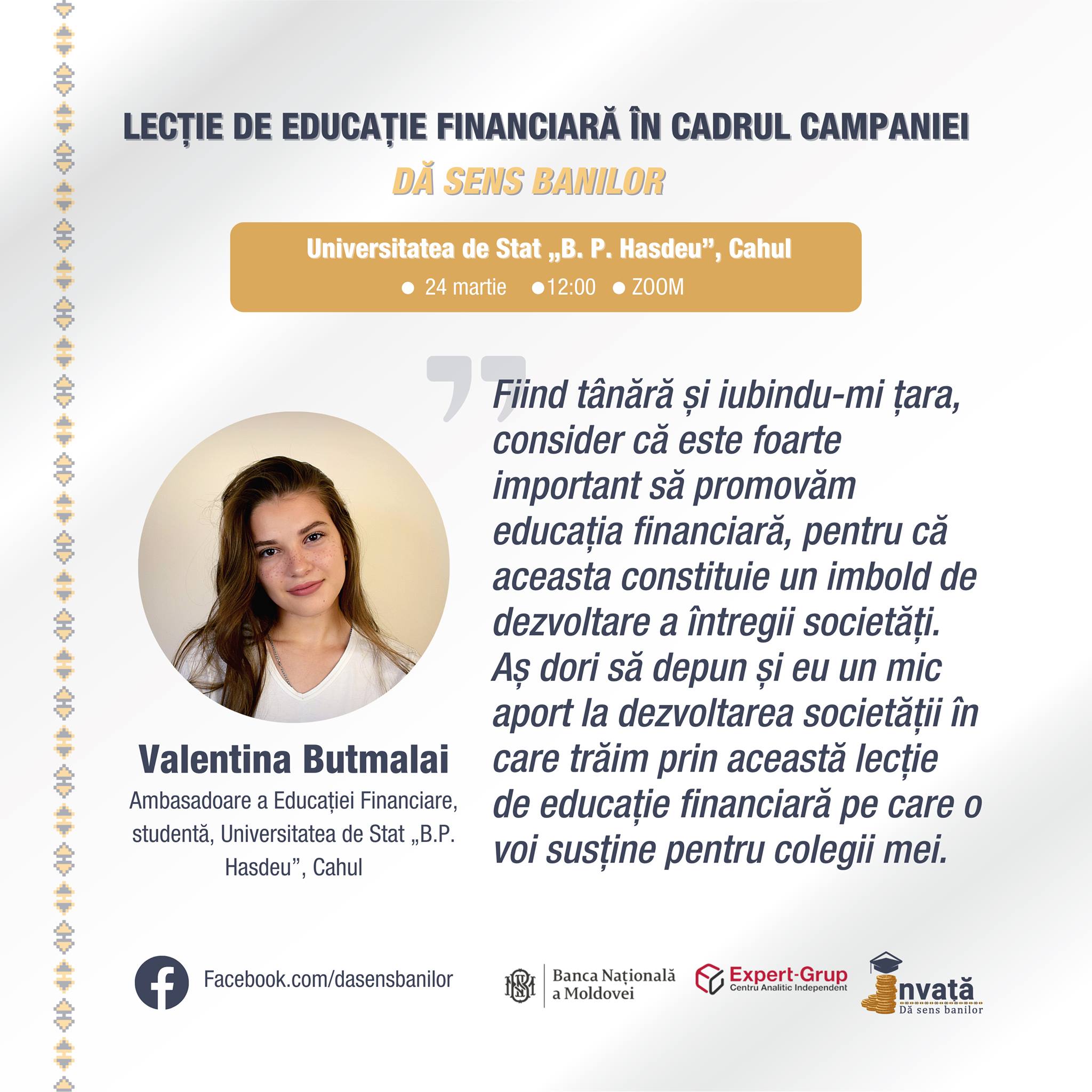 Valentina Butmalai, care este studentă la Universitatea de Stat „B.P. Hașdeu” din Cahul, precizează că s-a hotărât să promoveze educația financiară pentru a contribui la dezvoltarea țării „Fiind tânără și iubindu-mi țara, consider că este foarte important să promovăm educația financiară, pentru că aceasta constituie un imbold de dezvoltare a întregii societăți…