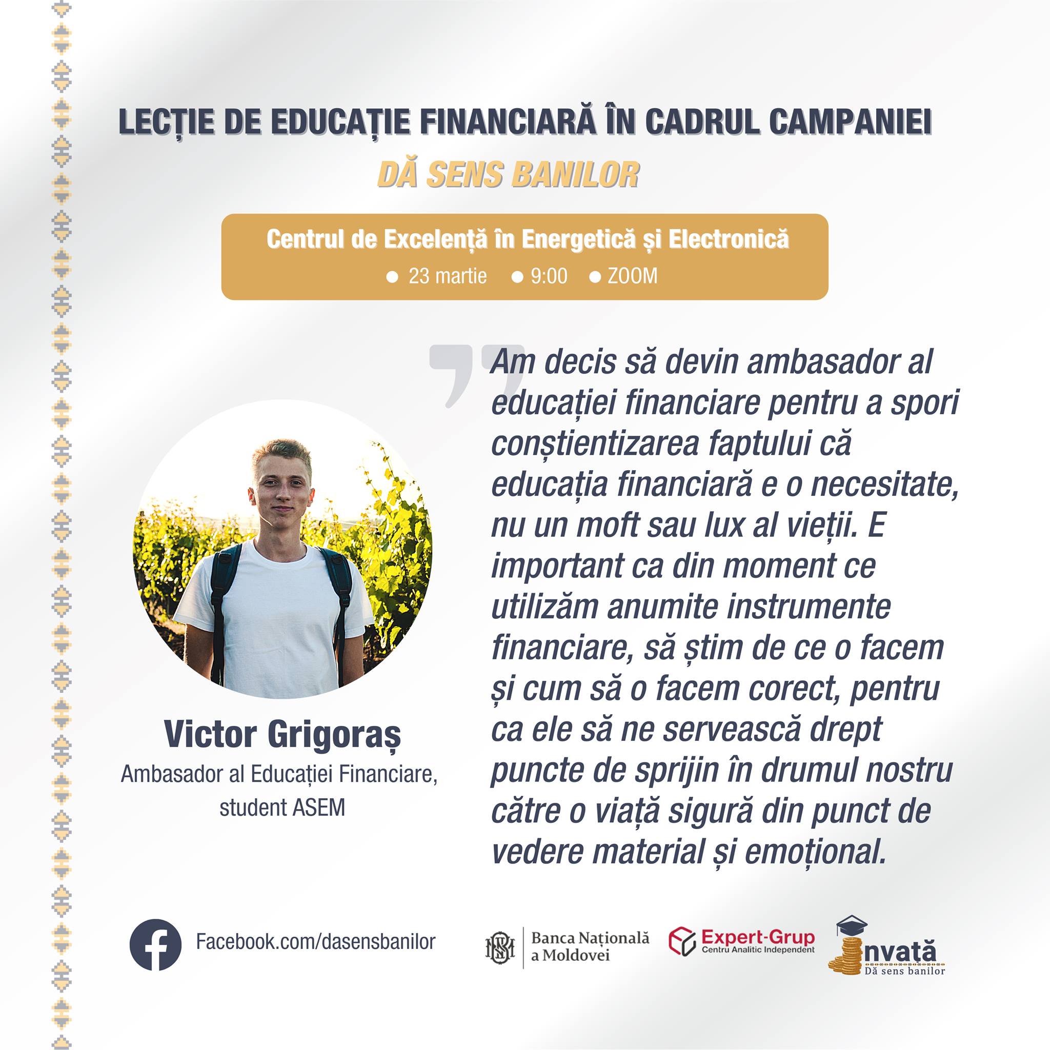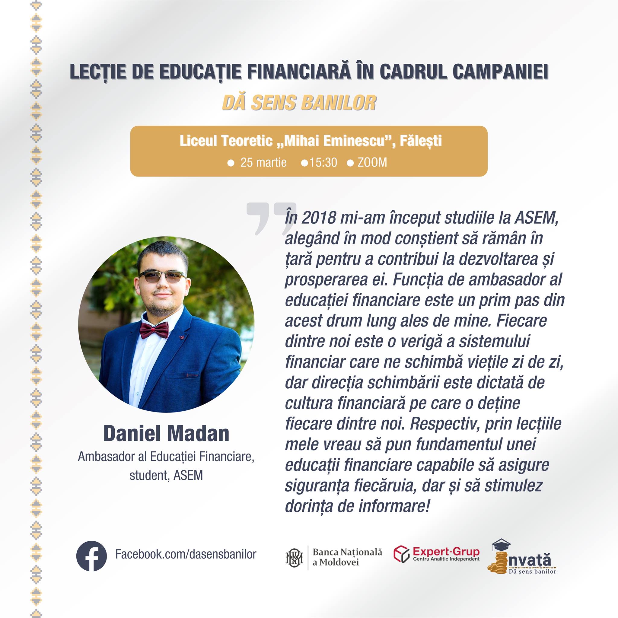 Seria lecțiilor din această săptămâna va fi încheiată de Daniel Madan, care este student la ASEM, dar va organiza instruirea pentru foștii săi colegi de la Liceul Teoretic ,,Mihai Eminescu" din Fălești. „În 2018 mi-am început studiile la ASEM, alegând în mod conștient să rămân în țară pentru a contribui la dezvoltarea și prosperitatea ei. Funcția de ambasador al educației financiare este un prim pas din acest drum lung ales de mine. Fiecare dintre noi este o verigă a sistemului financiar care ne schimbă viețile zi de zi, dar direcția schimbării este dictată de cultura financiară pe care o deține fiecare dintre noi. Respectiv, prin lecțiile mele vreau să pun fundamentul unei educații financiare capabile să dea siguranță fiecăruia, dar și să stimulez dorința de informare”, spune Daniel.