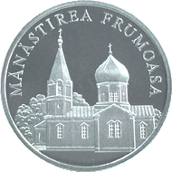 Monedă comemorativă din seria „Mănăstirile Moldovei”, în circulaţie din 25 decembrie 2000.